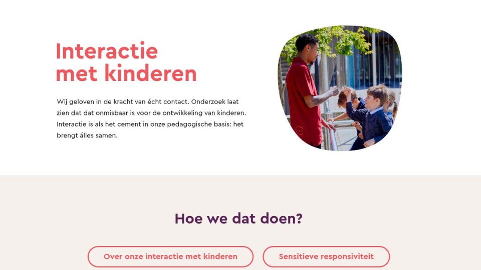 Wij geloven in de kracht van écht contact. Onderzoek laat zien dat dat onmisbaar is voor de ontwikkeling van kinderen. Interactie is als het cement in onze pedagogische basis: het brengt álles samen.