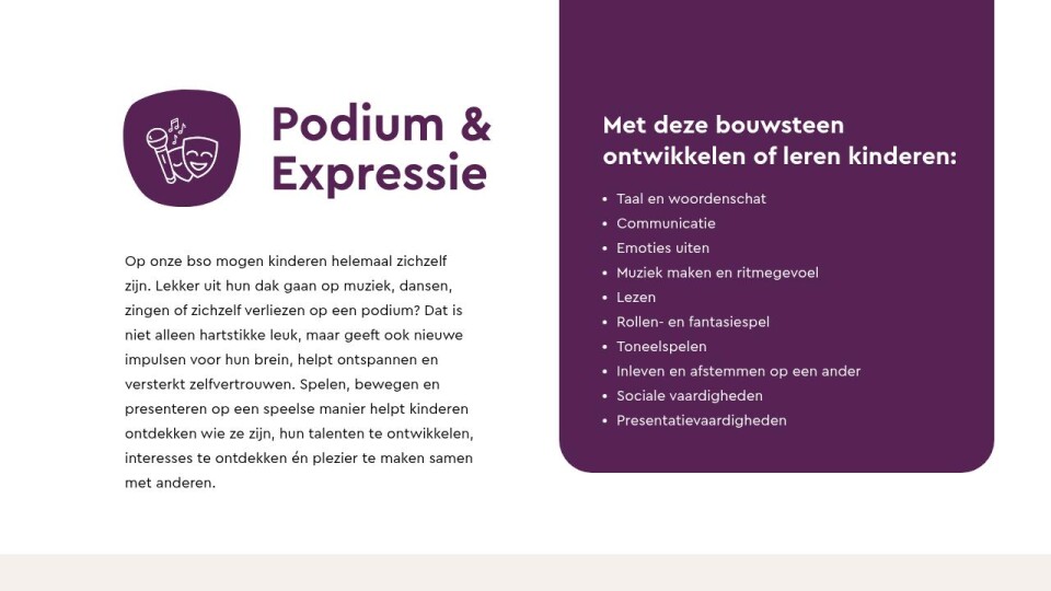 Op onze bso mogen kinderen helemaal zichzelf zijn. Lekker uit hun dak gaan op muziek, dansen, zingen of zichzelf verliezen op een podium? Dat is niet alleen hartstikke leuk, maar geeft ook nieuwe impulsen voor hun brein, helpt ontspannen en versterkt zelfvertrouwen. Spelen, bewegen en presenteren op een speelse manier helpt kinderen ontdekken wie ze zijn, hun talenten te ontwikkelen, interesses te ontdekken én plezier te maken samen met anderen.