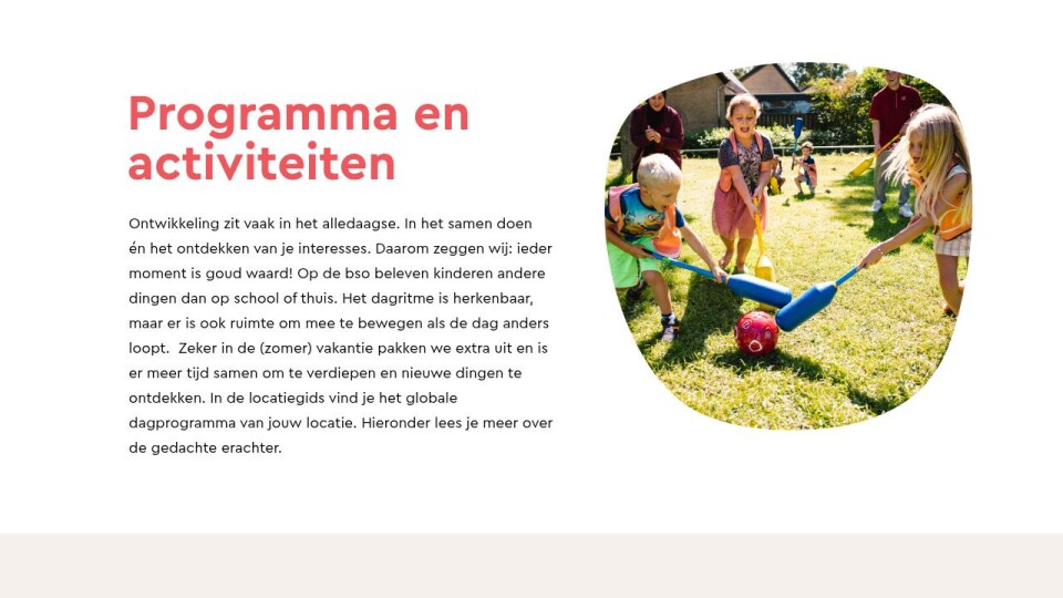 Ons programma bestaat uit vaste onderdelen, zoals (vrij) spelen, georganiseerde activiteiten, naar buiten gaan en samen eten en drinken. Voor de jongste groepen bieden we dit in een voorspelbaar ritme aan, terwijl oudere kinderen meer vrijheid krijgen en we kijken wat het beste bij de groep past. In de vakanties voegen we extra leuke activiteiten, workshops of uitstapjes toe, afgestemd op de leeftijd en zelfredzaamheid van de kinderen.