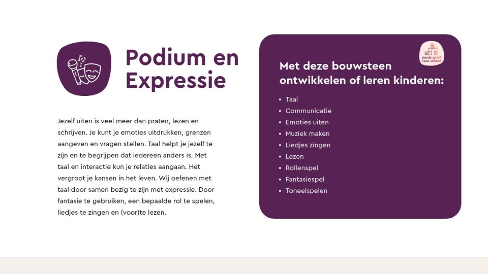 Zingen, naar muziek luisteren of zelf een instrument bespelen. Dansen of opgaan in een fantasiespel. Podiumkunsten geven kinderen de kans om zich op verschillende manieren te uiten. Dat is goed voor acceptatie en maakt ruimte voor diversiteit. Bij Partou mag je jezelf zijn. Dat zie je terug in deze bouwsteen.