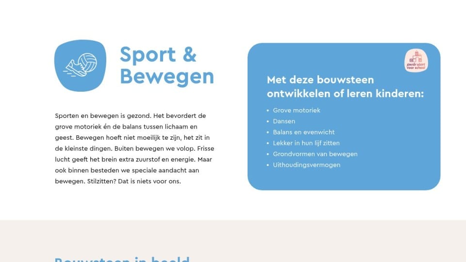 Sporten en bewegen is gezond. Het bevordert de grove motoriek én de balans tussen lichaam en geest. Bewegen hoeft niet moeilijk te zijn, het zit in de kleinste dingen. Buiten bewegen we volop. Frisse lucht geeft het brein extra zuurstof en energie. Maar ook binnen besteden we speciale aandacht aan bewegen. Stilzitten? Dat is niets voor ons.