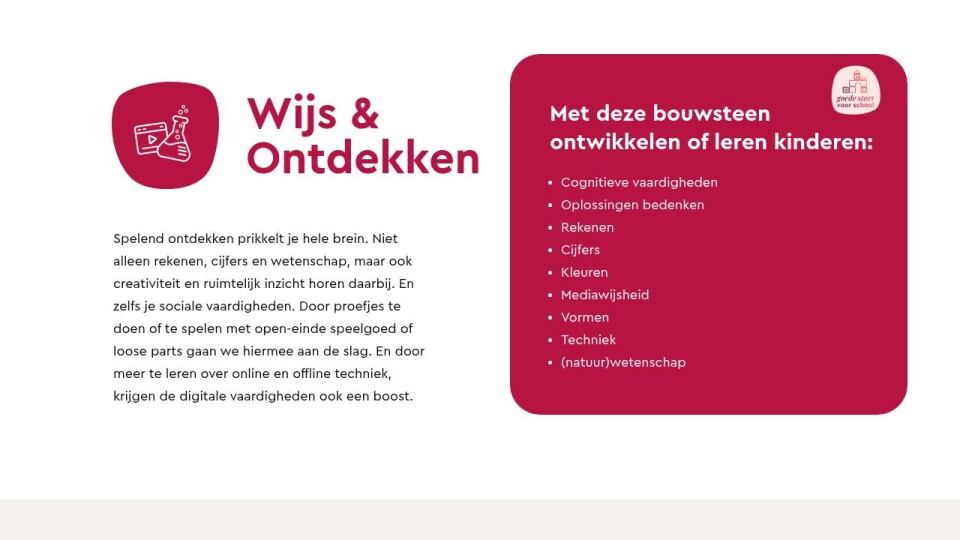 Onderwerpen als wetenschap, ruimtelijk inzicht, techniek, rekenen en cijfers, taal en denken vind je terug in deze bouwsteen. Er zijn veel vaardigheden die kinderen nodig hebben in deze tijd. Denk aan zelfregulering, creativiteit, samenwerken met mensen van verschillende achtergronden, communiceren, probleemoplossend werken, kritisch denken en digitale geletterdheid. De kinderopvang is bij uitstek een plek waar de ontwikkeling van deze vaardigheden uitgebreid aan bod komt. Zo ontdekt een baby welke bal zwaar is en wel materiaal licht. Een dreumes welke vormpjes er in de vormenstoof passen en welke niet. En leert een peuter hoe je van water en zand modder maakt en dat een emmer vol modder veel zwaarder is dan een emmer vol zand. En leert het tellen door liedjes als ‘twee emmertjes water halen’. Door het aantal kinderen te tellen dat aan tafel zit of het aantal kleurtjes waar je mee kleurt, is een peuter aan het rekenen. De ene doos in de andere passen, is een ervaring van klein, groter, grootst.